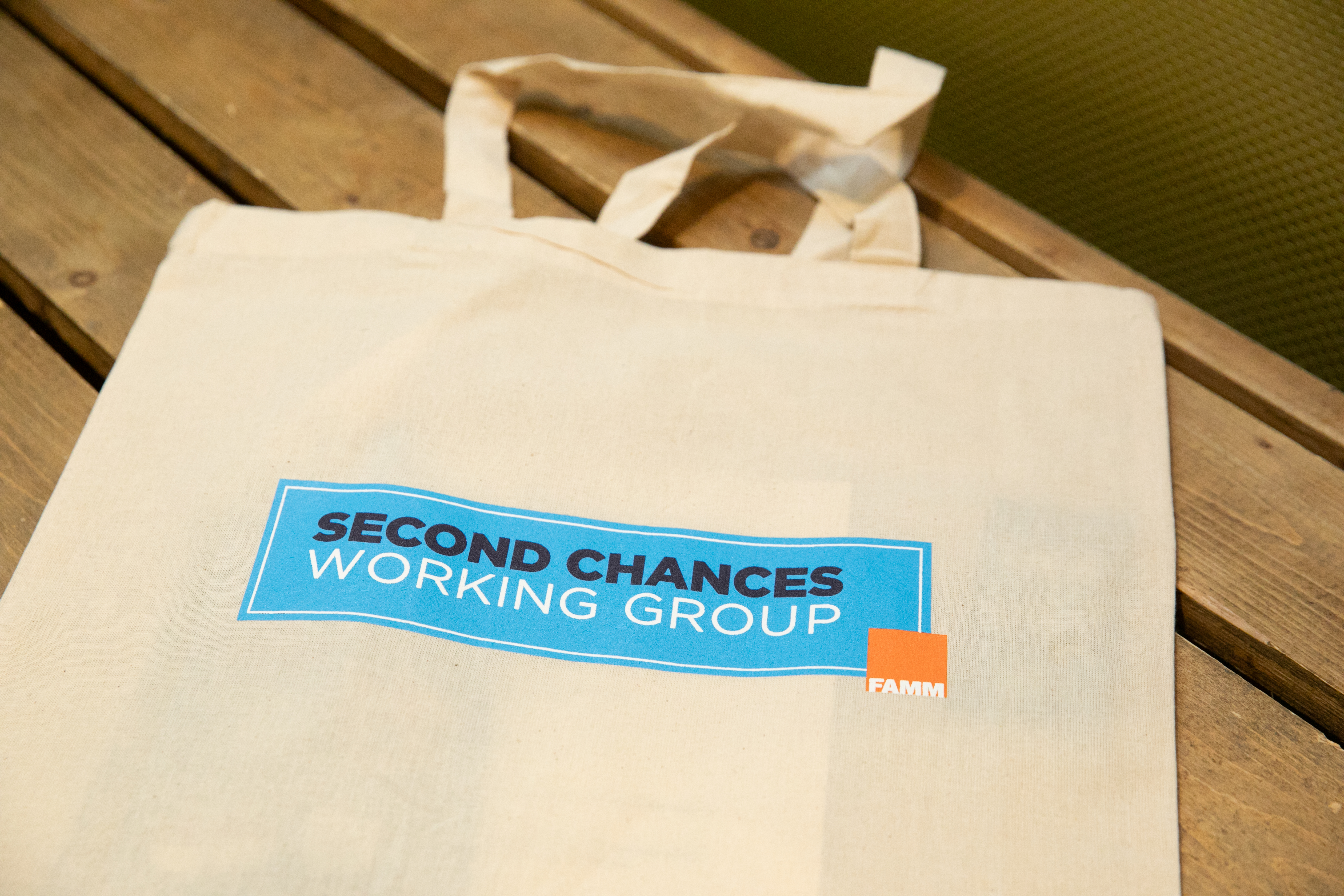 Canvas tote bag on a wooden table printed with the text “SECOND CHANCES WORKING GROUP” and a small FAMM logo.