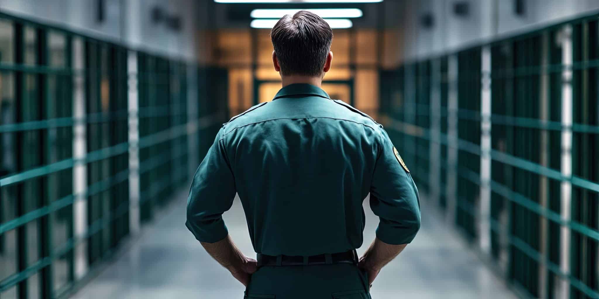 Prison Warden Standing In Hallway Filled With Cells During Lockdown